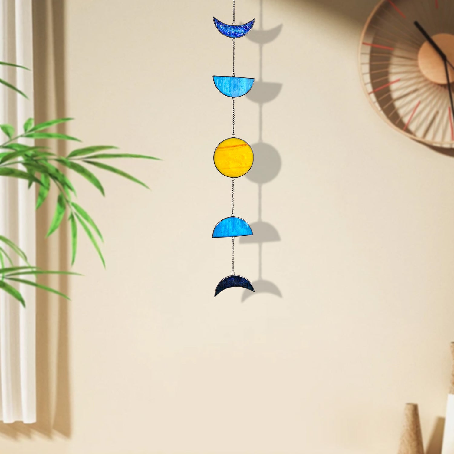 Watch sunlight dance through handcrafted celestial stained glass moon suncatcher. Each unique suncatcher casts magical reflections, adding warmth and dreamy charm to your home. Perfect for gifting or creating a peaceful, mystical atmosphere.