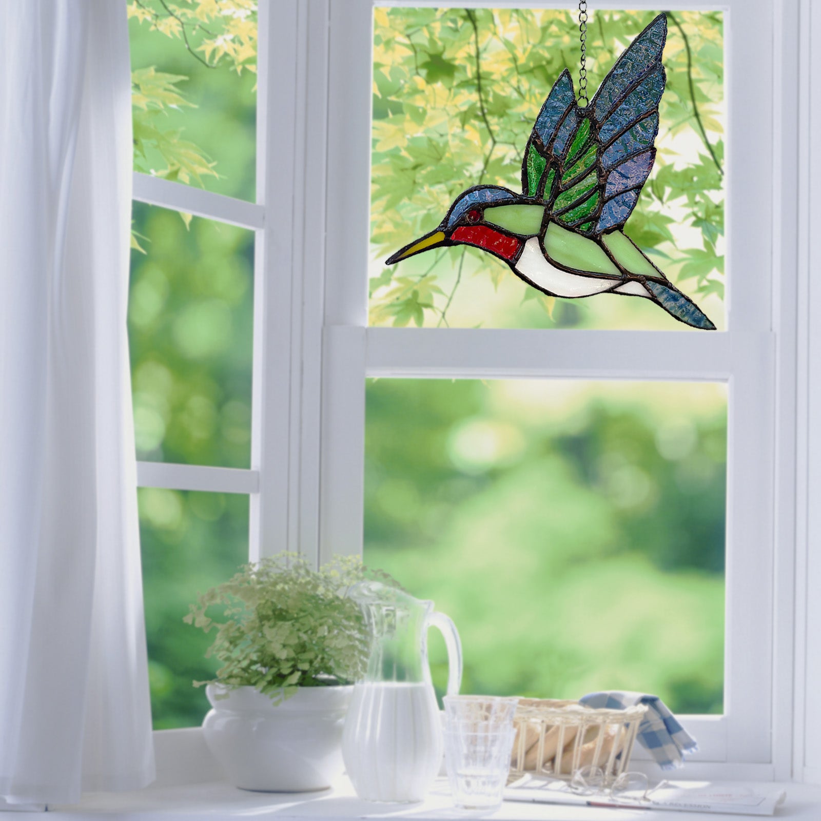 Blue & Green Hummingbird Stained Glass Suncatcher Window Hanging